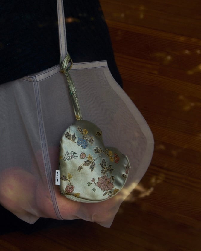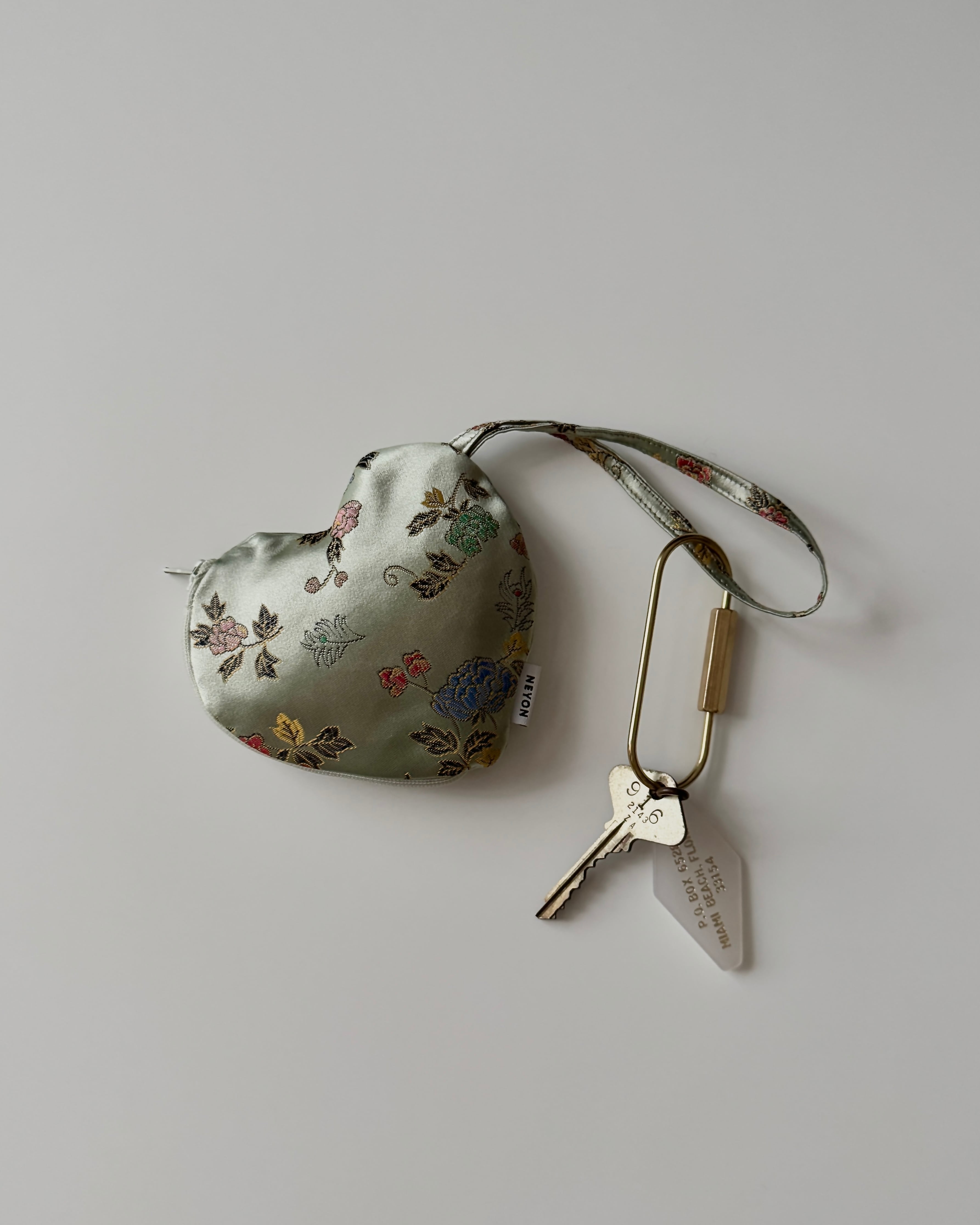 韓国伝統文様のバラの織り柄が入ったヤンダン生地の裏地付きハートポーチ。