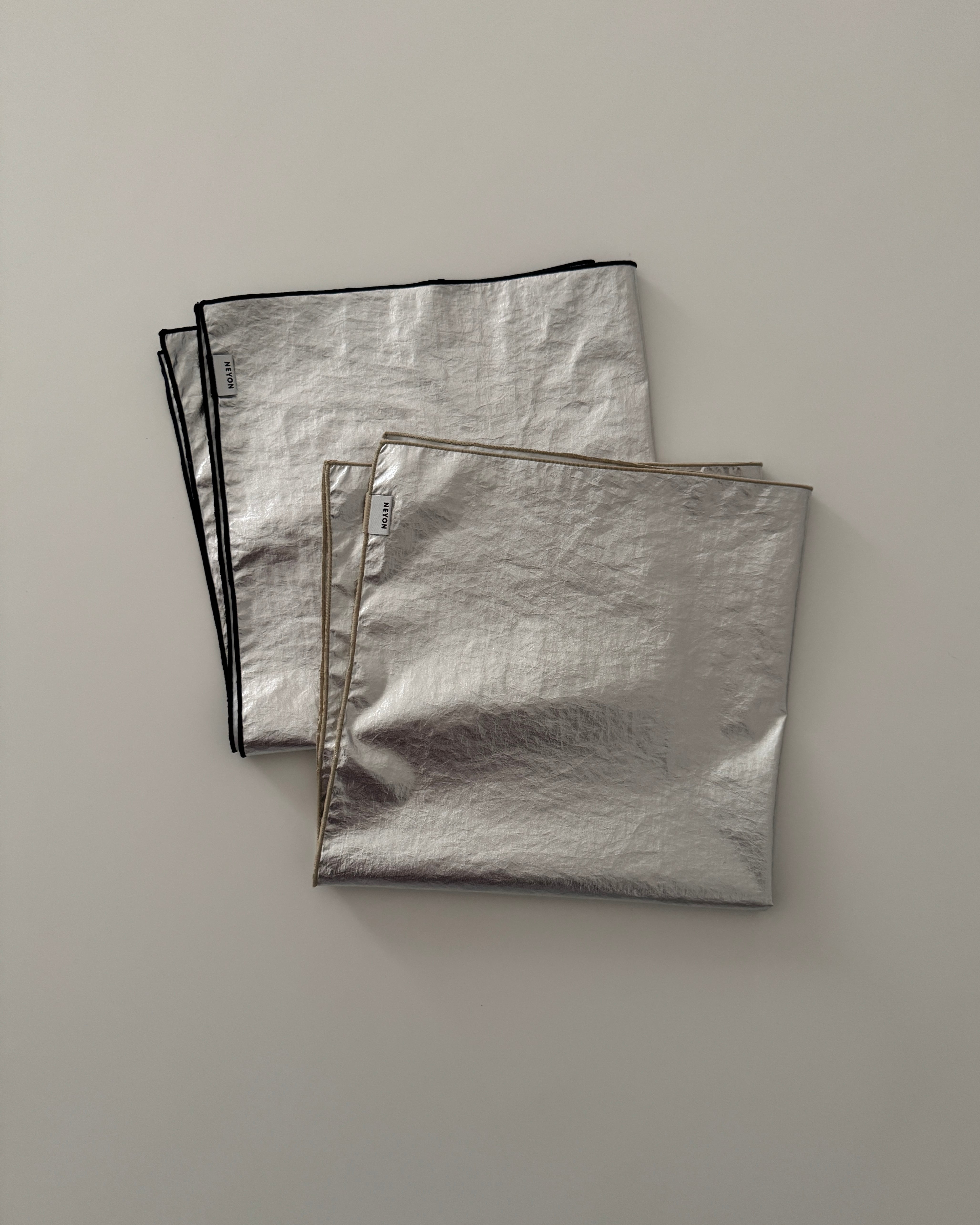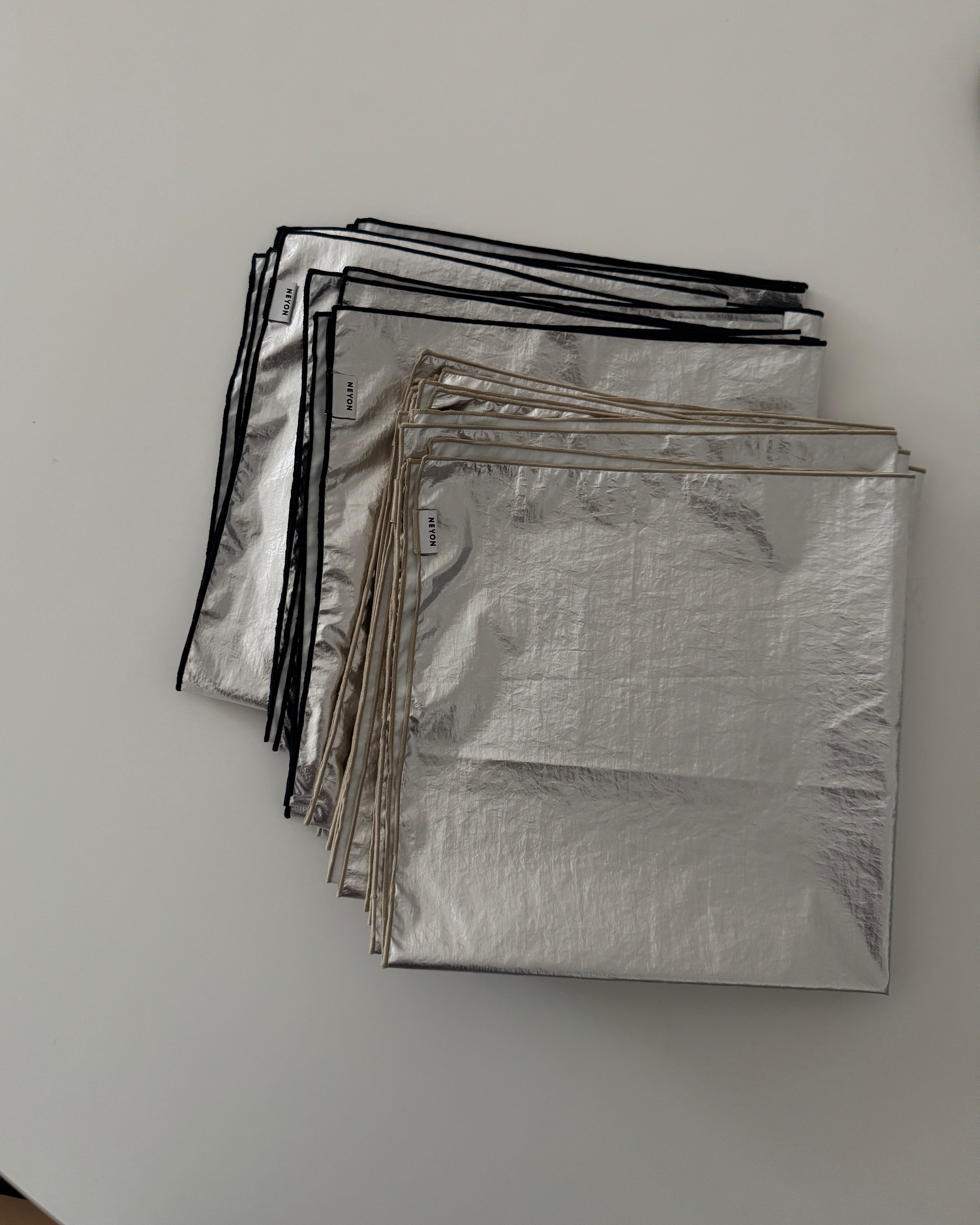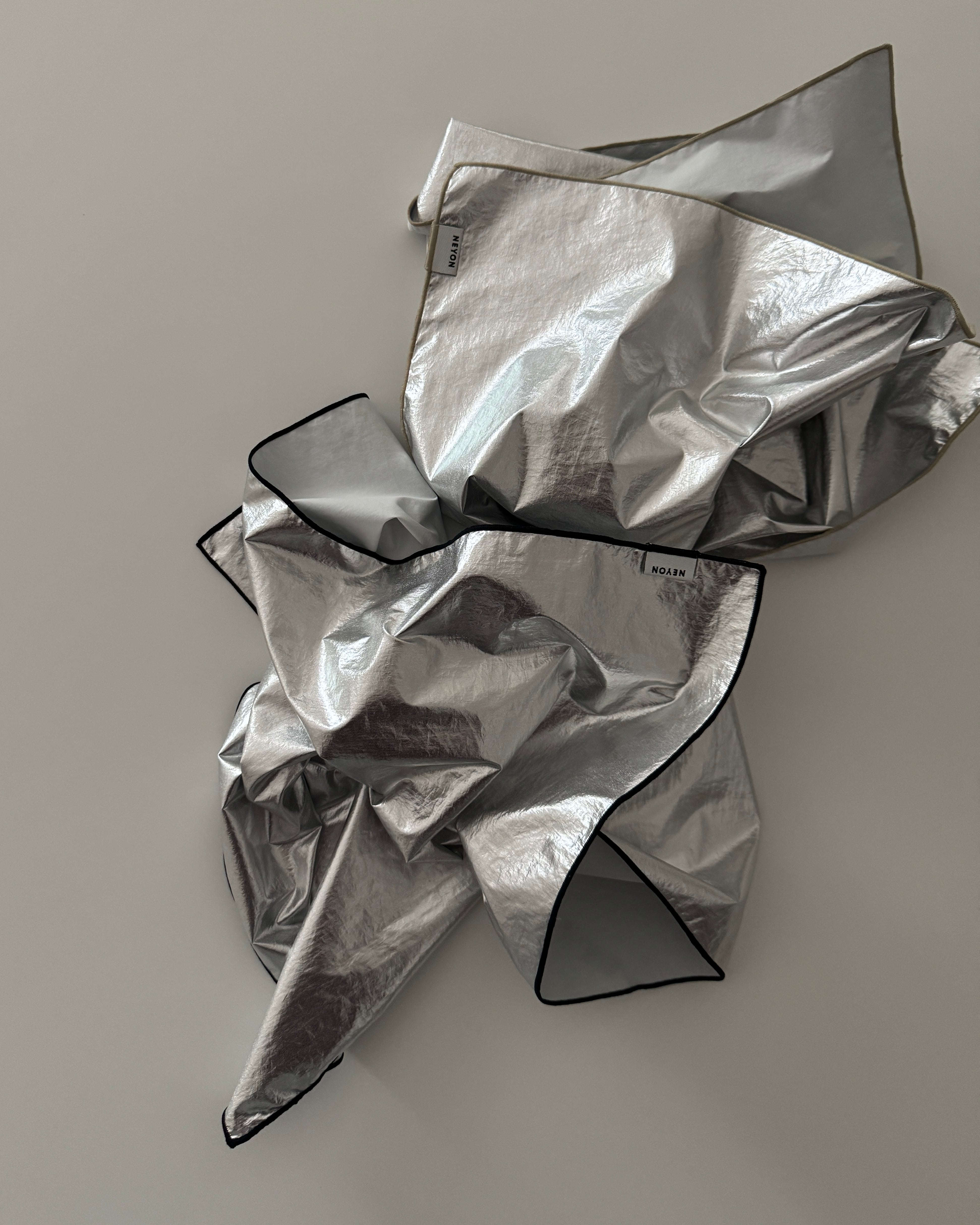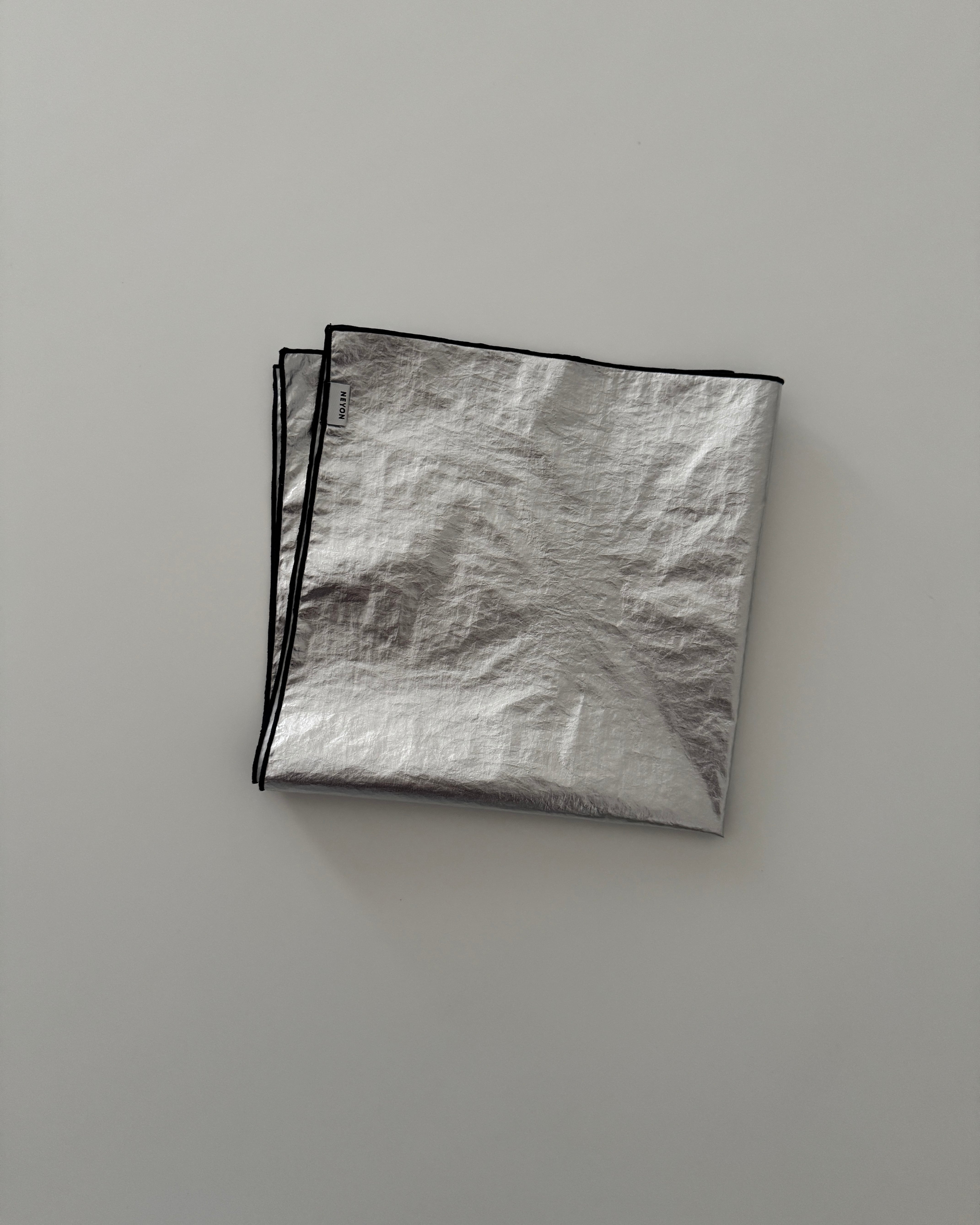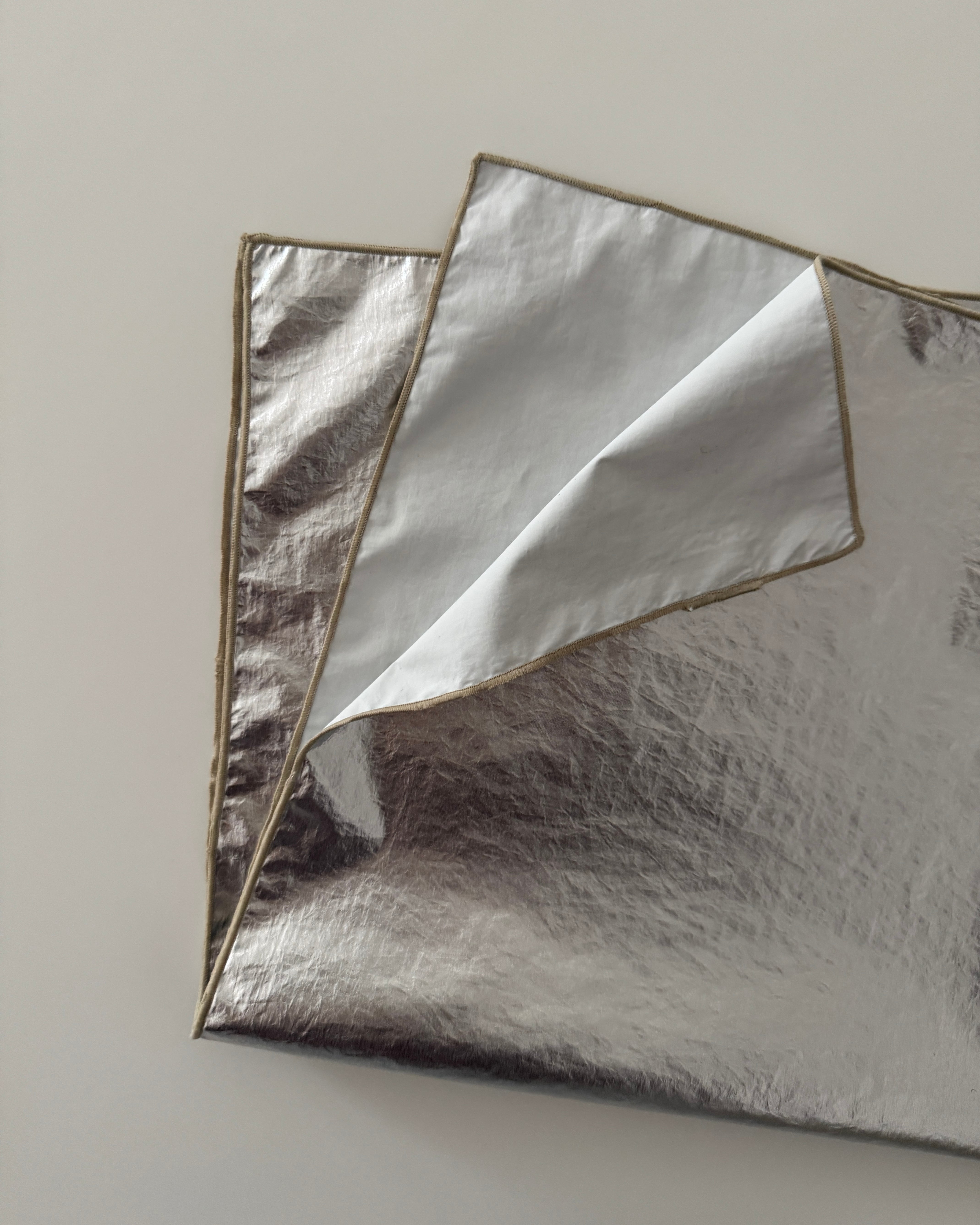 やわらかい光沢をまとった、シルバーメタリックのポジャギ