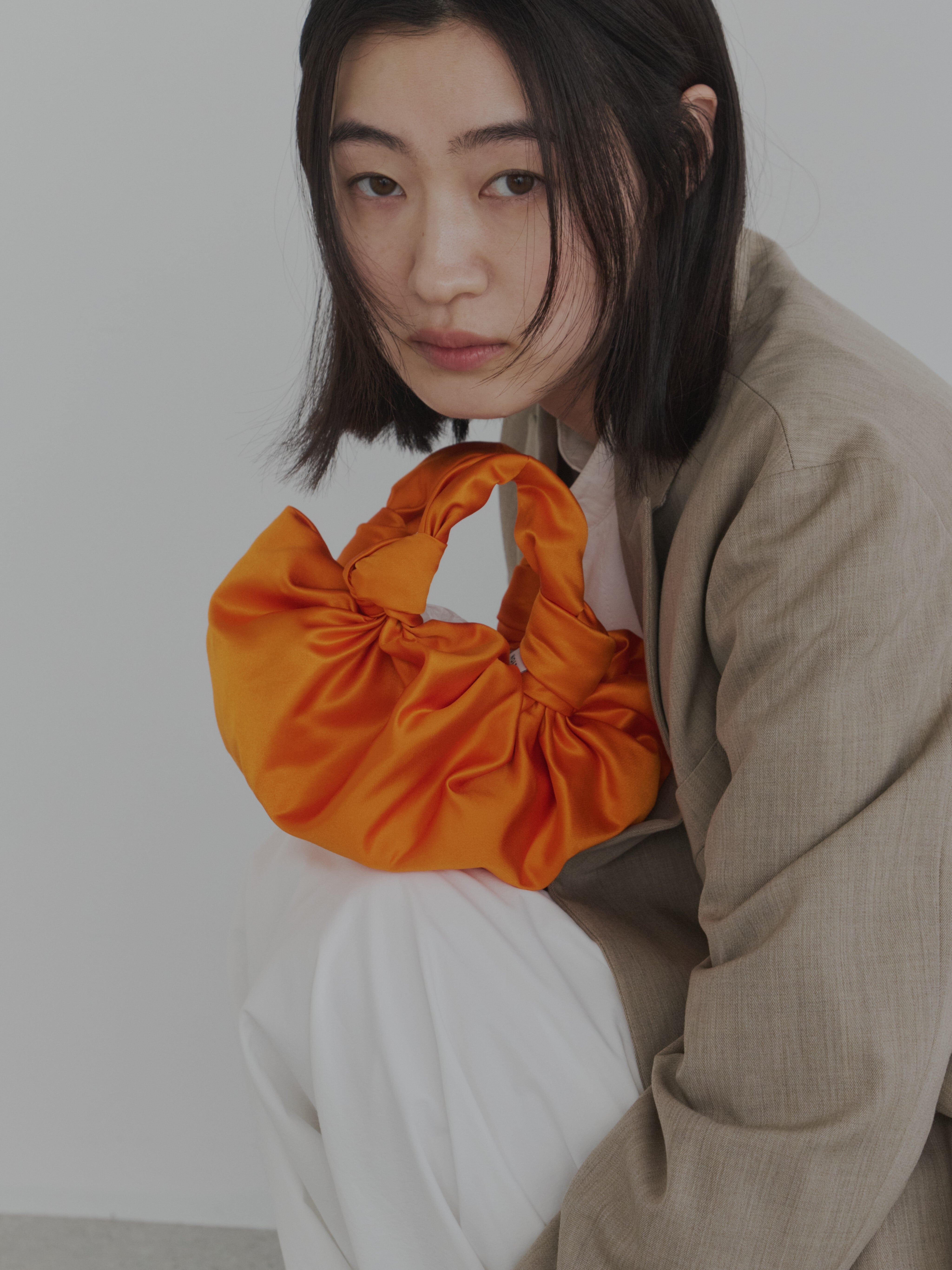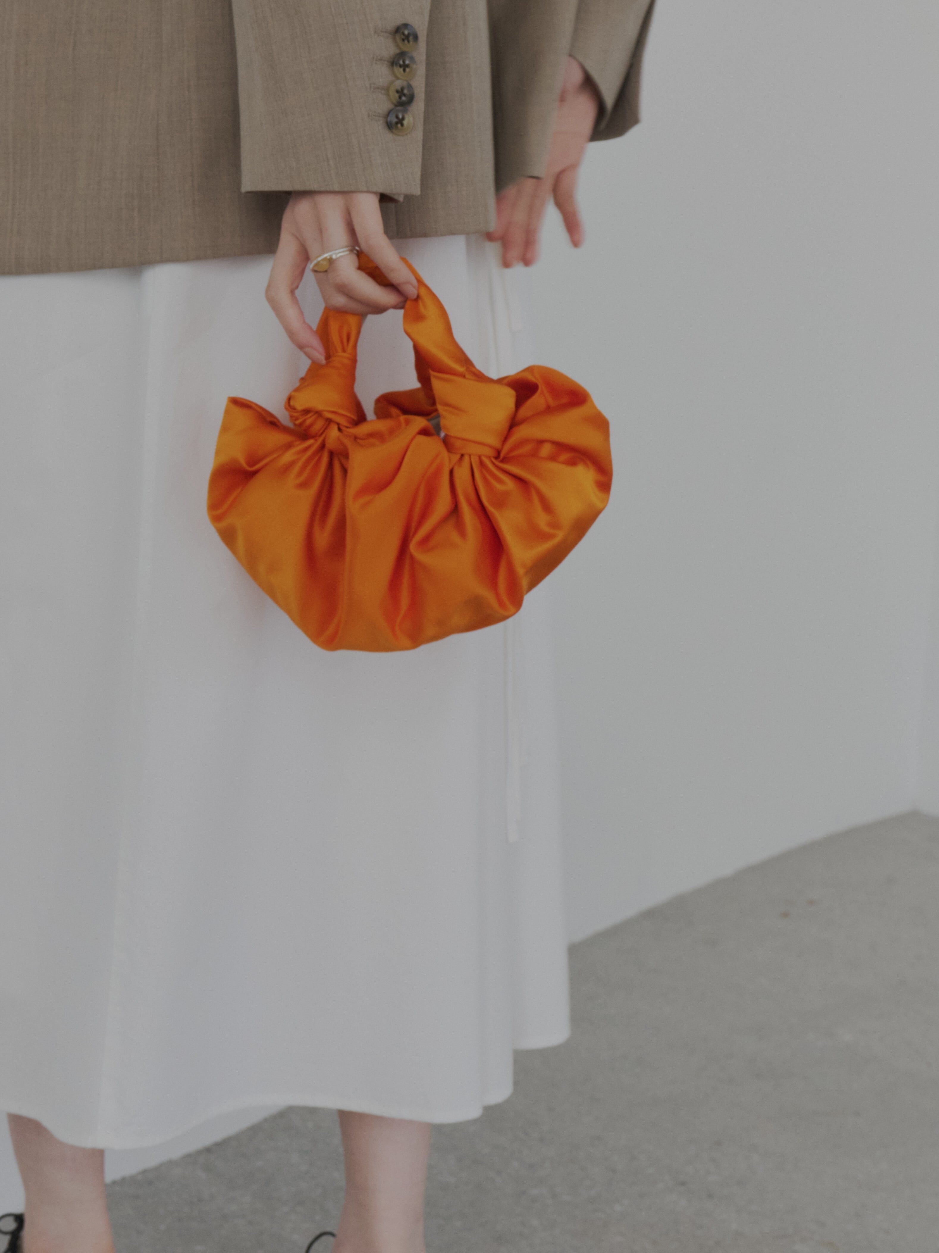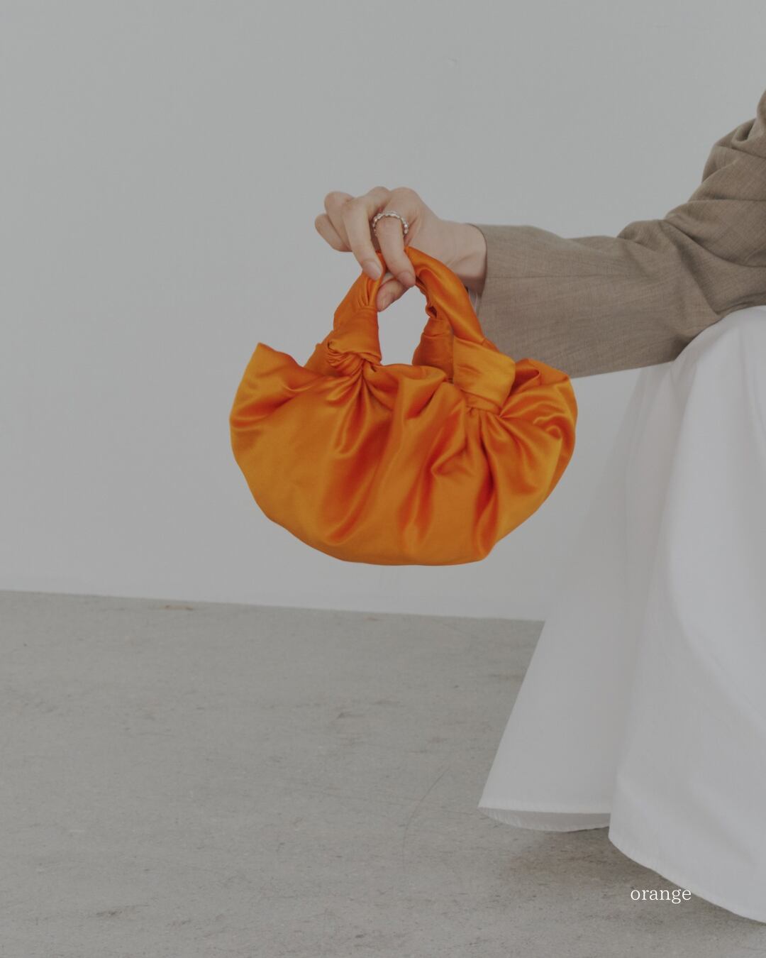 コットンシルクサテンの落ち着いた光沢感、結び目部分の滑らかなドレープが美しいバッグです。