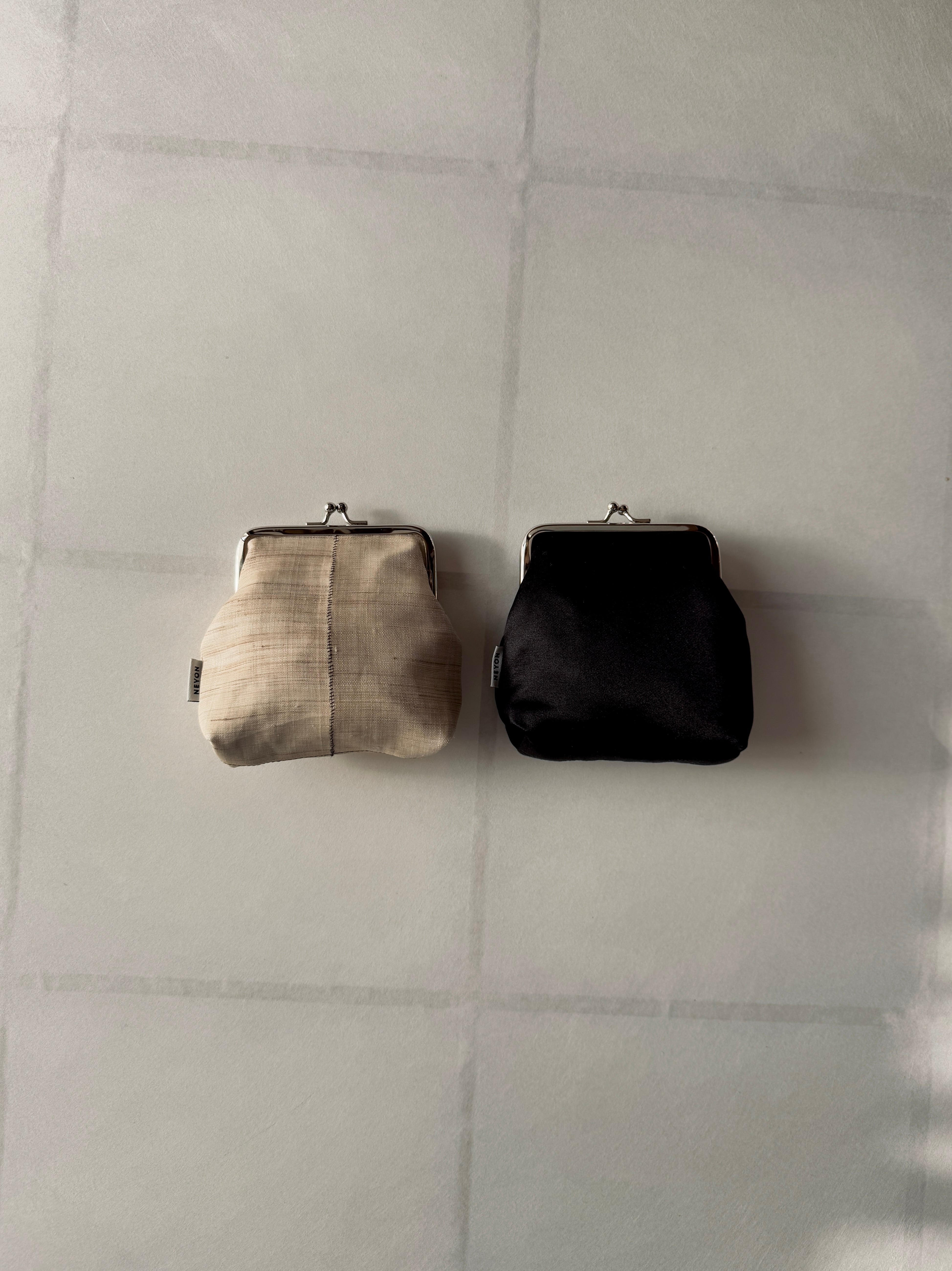 晋州(ジンジュ)産のコットンシルクサテンを使用した、マチ付きのがま口ポーチ。